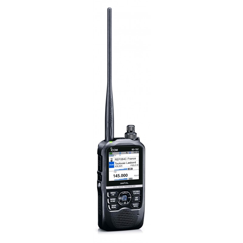 Portatif radioamateur VHF/UHF, 144-146 / 430-440MHz bi-bande simultanées, 5W, 500 canaux, écran couleur LCD, D-STAR modes Point d'accès/Terminal, DV/FM/FM-N, messages textes en D-STAR. Réception des bandes VHF aéro. GPS intégré pour fonctions Position Auto Reply, Near Repeater Search, logs GPS. Connecteur micro USB pour charge ou programmation. Emplacement carte microSD. Protection IPX7. Livré avec antenne, batterie, chargeur mural, clip ceinture et dragonne.