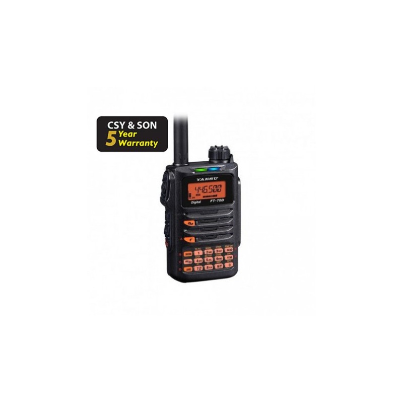Emetteur-récepteur portable 5W VHF/UHF, analogique et numérique C4FM. Le FT-70DE fournit jusqu'à 5W de puissance RF, et son grand haut-parleur avant fournit 700mW de sortie audio. En mode C4FM, il a un meilleur TEB (taux d'erreur sur les bits) que les autres modulations numériques.